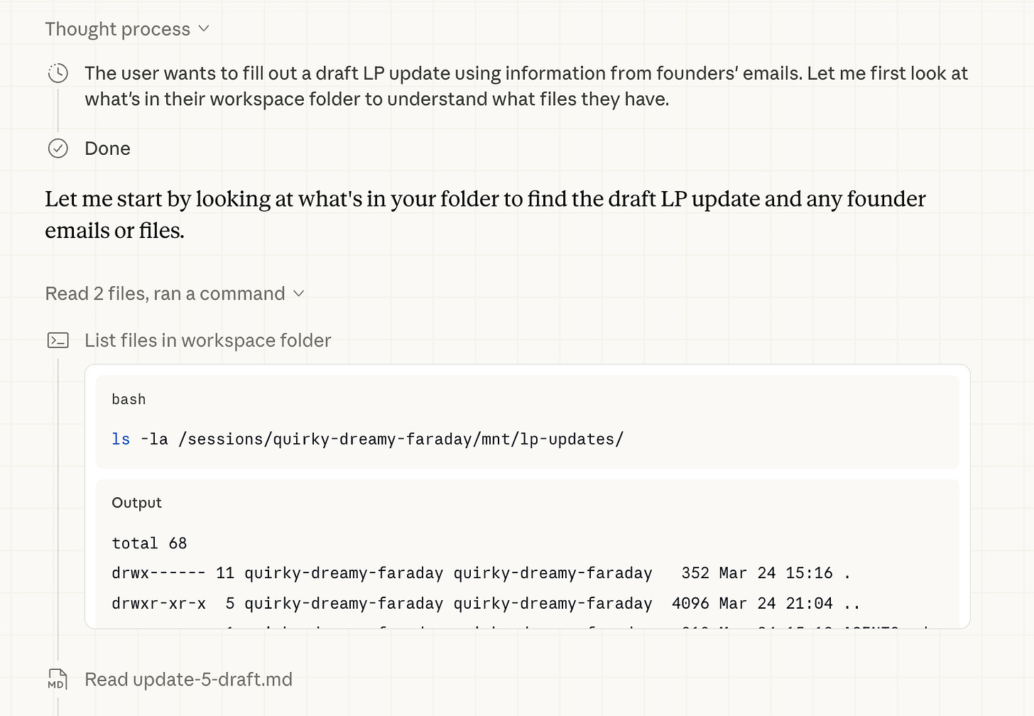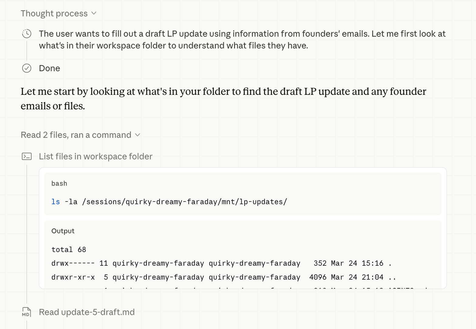 If an agent like Cowork is doing a task, you can click to expand what it ran and see the detail — like this example listing files to find recent fund updates.