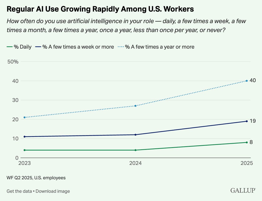According to a new Gallup poll, the number of workers who say they use AI at work has nearly doubled in the past year.