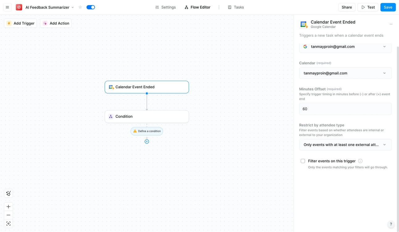Create a new workflow in Lindy.ai and connect it with Google Calendar. Configure it to trigger after appointments end, filtering for external attendees only to avoid feedback requests for internal meetings.