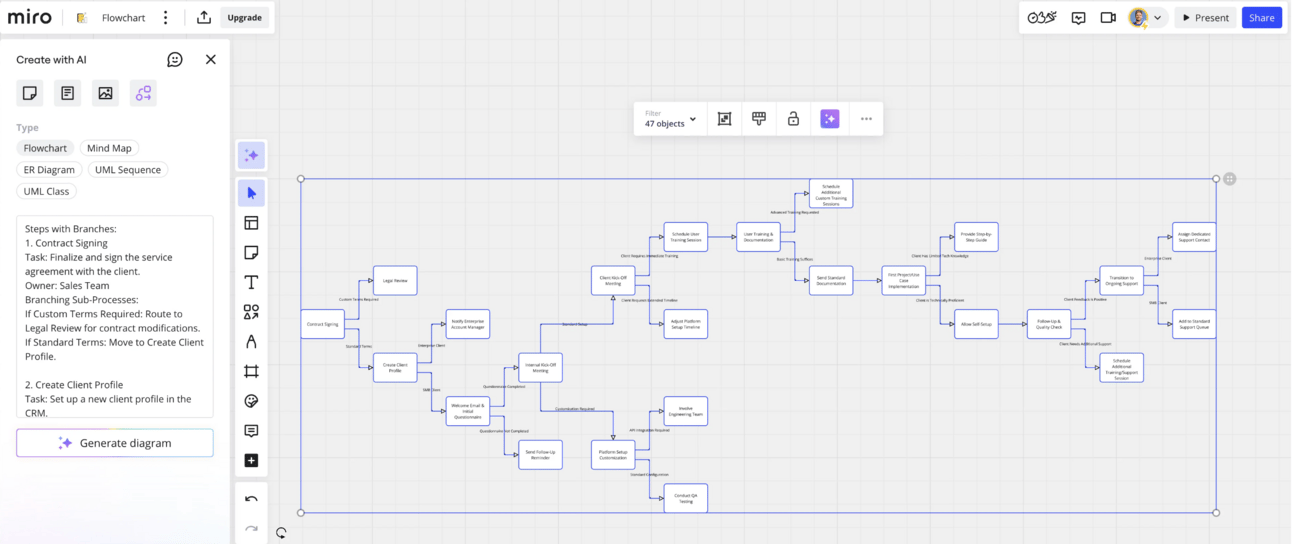 Every SOP document can be clearer with a visual flowchart, but manually creating one means hours of dragging shapes and arrows around. Here's how Miro's AI turns your text docs into polished flowcharts instantly: