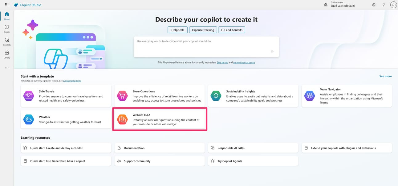 Start with the "Website Q&A" template in Copilot Studio. Add your public website or SharePoint site as a knowledge source for the agent to reference.