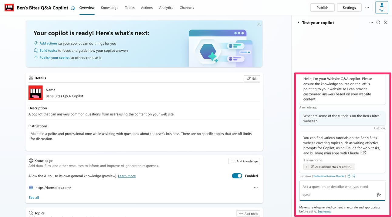 Creating a custom AI chatbot within your Microsoft 365 workspace grounded in your knowledge docs.