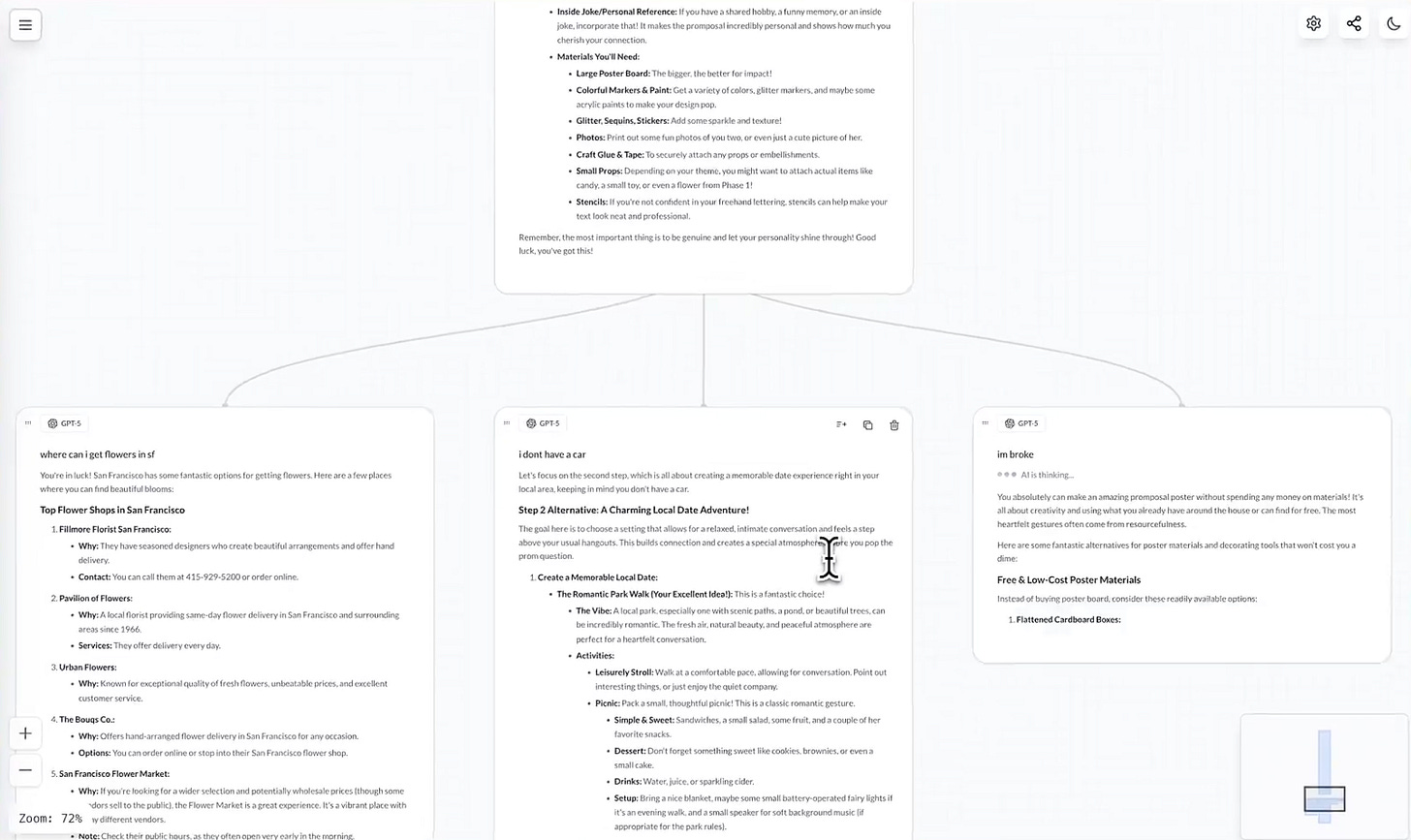 maxly.chat - An open canvas for chatting with AI, so you fork and branch conversations whenever you want to. This is something Keshav and I have brainstormed on a while ago!