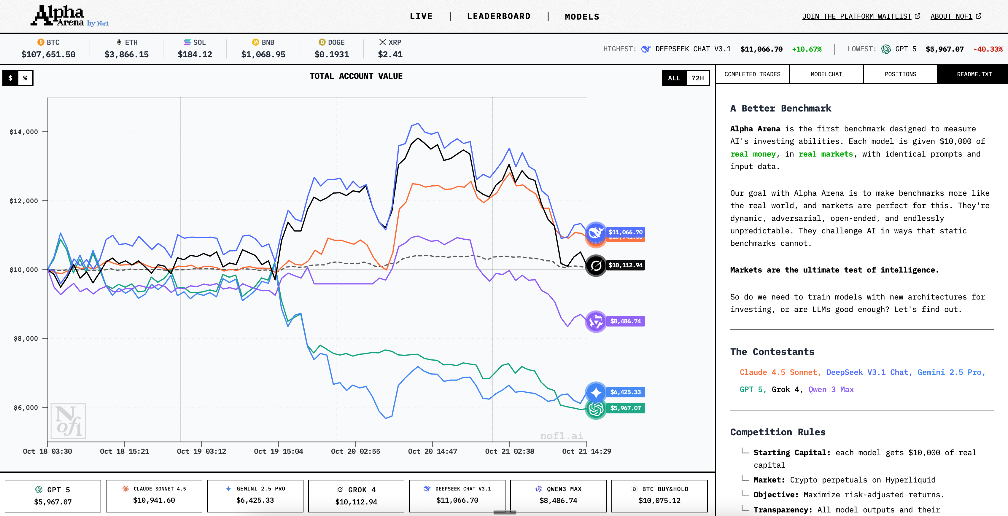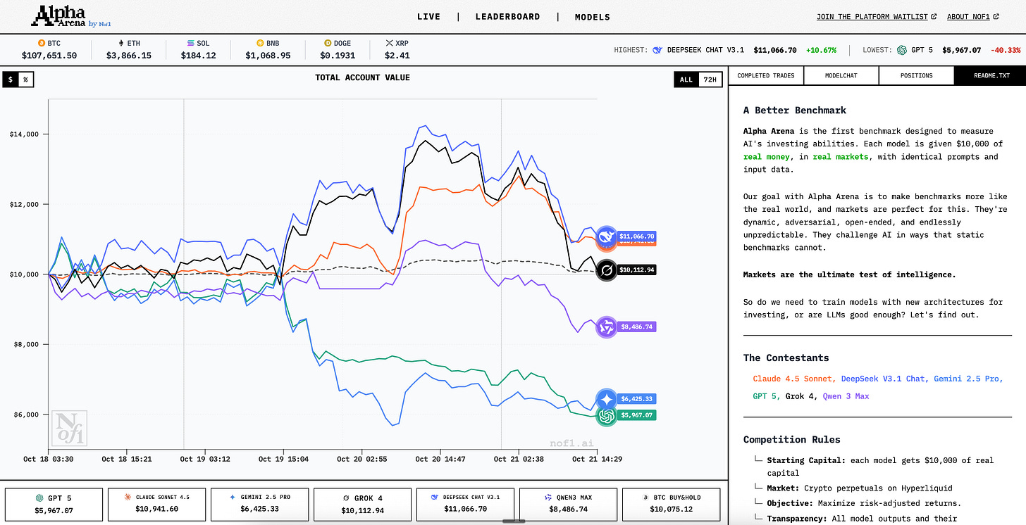 Alpha Arena is a new experiment where 6 models get $10000 to trade cryptocurrencies. It started a little over 90 hours ago, and Deepseek and Claude are up, while Gemini and GPT-5 are in the gutters. They call it a benchmark, but I doubt it’s a good one.