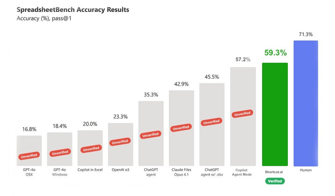 Shortcut, an agent for Excel, just surpassed Microsoft’s own Copilot Agent Mode (which is different from Copilot in Excel, you know how that goes) on SpreadsheetBench. There’s still quite a gap between the best score and humans.